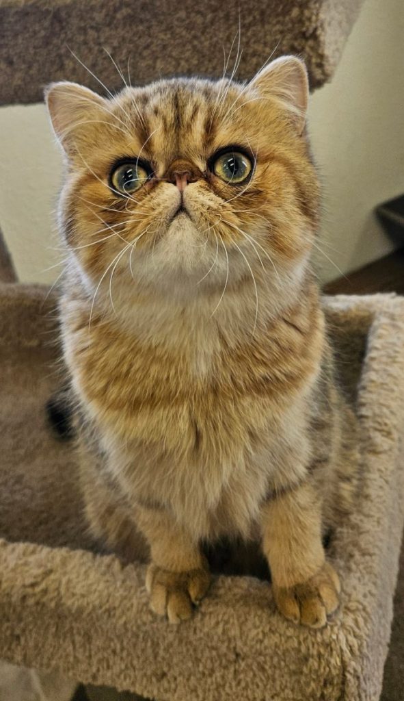 Exotics, and their parent breed, Persians, come in large palette of colors and patterns. Goldens and silvers are seldom seen colors, with a limited number of breeders working with this division. Both Golden and Silver Exotics are known for their sweet, calm, and affectionate personalities. They are known to be affectionate “lap cats” & adapt well to indoor living. They tend to be very gentle, sociable, and good with children and other pets. Exotic Golden & Silvers tend to be less active and more laid-back than many breeds — they love lounging. They are also Intelligent and playful, but not overly demanding of attention. Despite their shorter coat, Exotic Shorthairs still benefit from regular brushing (2–3 times a week) to prevent matting and reduce shedding. There are a lot of qualities to strive for. Heavy boned cobby bodies. Green eyes, lined with black. A brick red nose leather, edged in black. Lips and paw pads are also black. I strive for a sweet expression and large, wide-open eyes. The coat color can be as varied as a blond hair color chart, from pale honey to rich copper. And of course, a healthy cat with a sweet temperament. Just take a look at the cute little golden Exotic kittens!